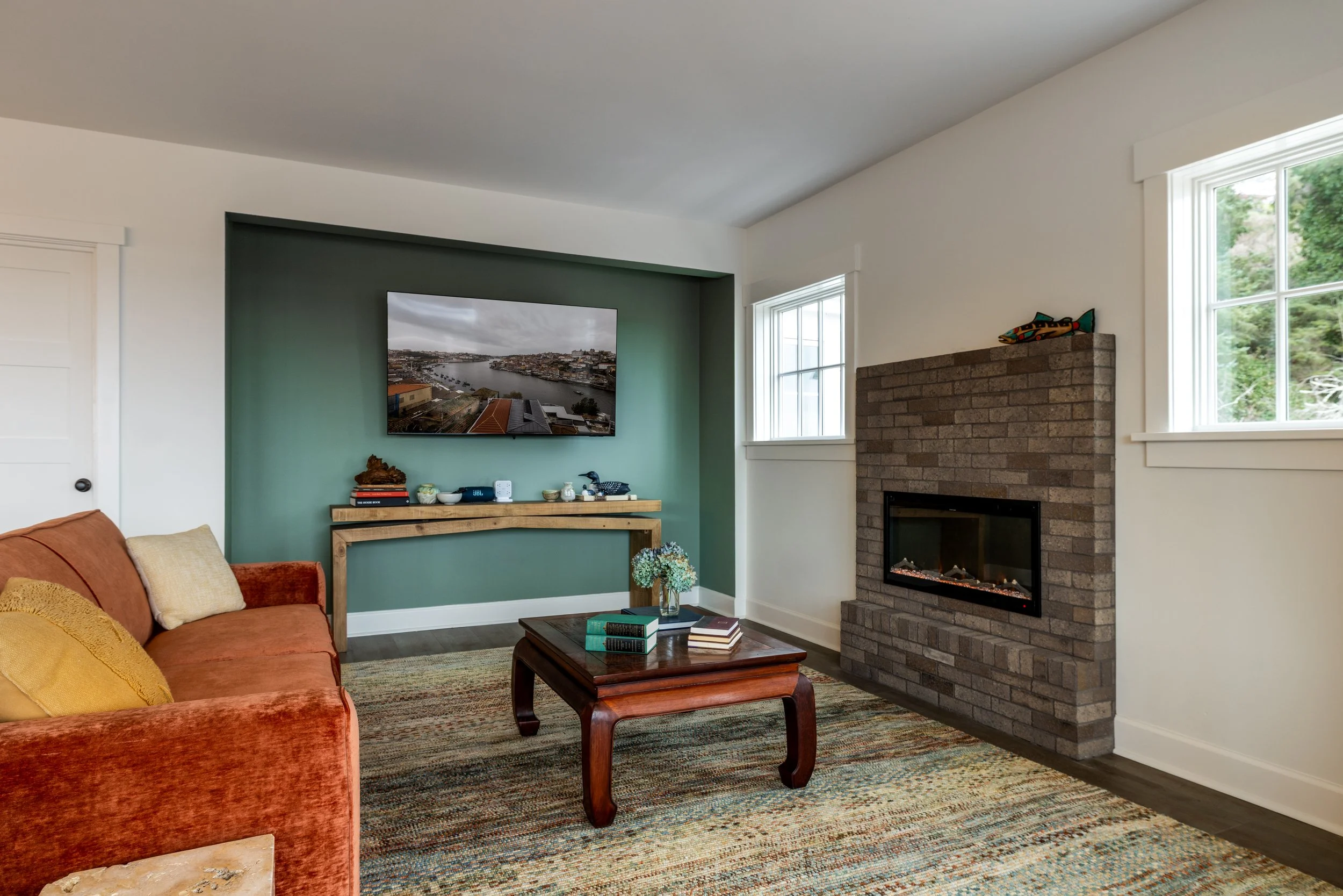 The cozy living room across from the kitchen island invites gatherings, where the warm glow of the fireplace complements plush seating arranged for groups; a JBL speaker can connect to your device for playing music while a Samsung TV allows you to access your streaming services via Roku. The space includes a coffee table and board games, calling you and your guests to a friendly competition.