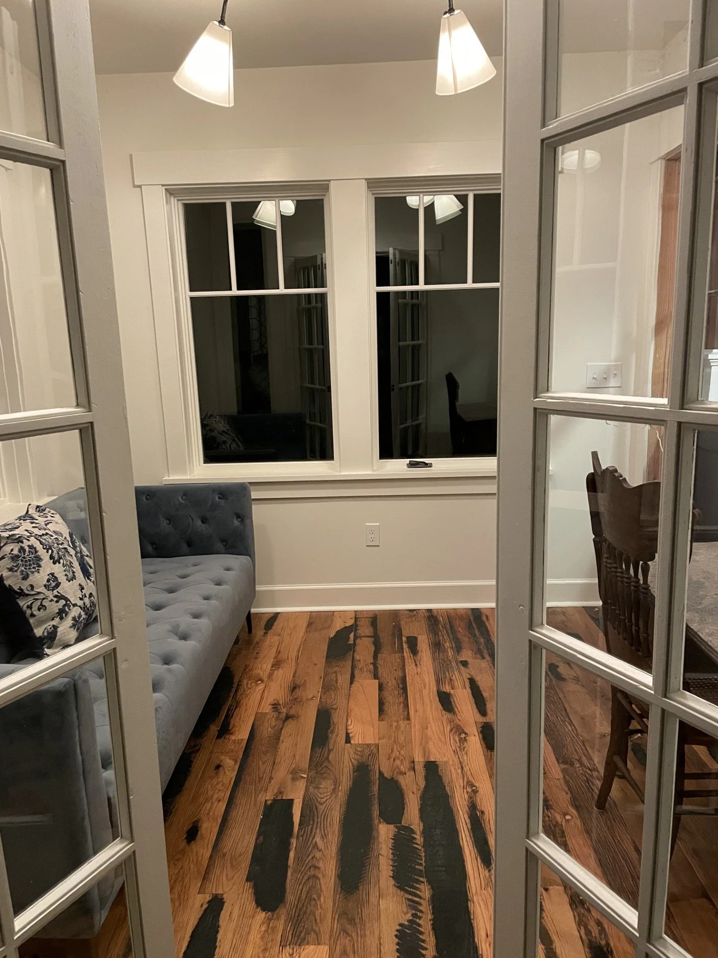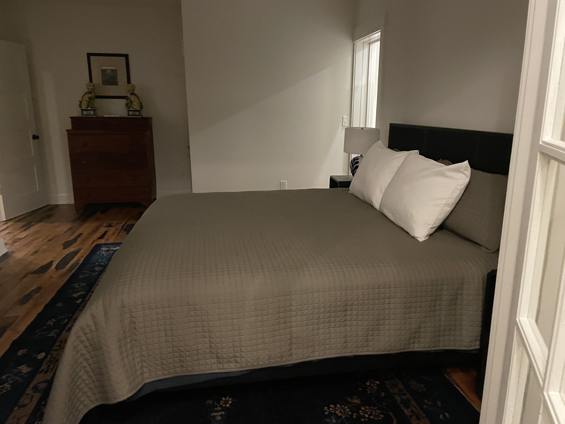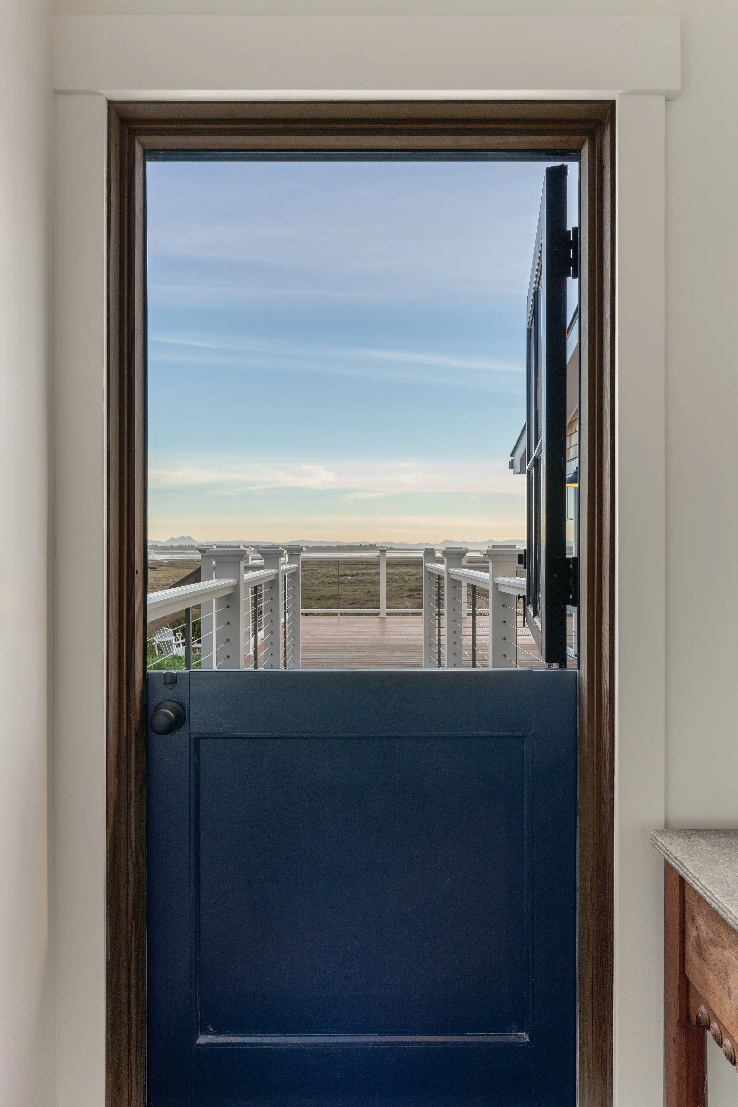 Directly off the living room, the primary suite features an en suite office facing the water, appointed with a comfortable couch, a work-ready desk, and a Dutch door opening to the breeze, all set atop refurbished barnwood floors reclaimed from Kentucky; its adjoining spa-like bathroom offers an oversized shower and a soaking tub for ultimate relaxation.