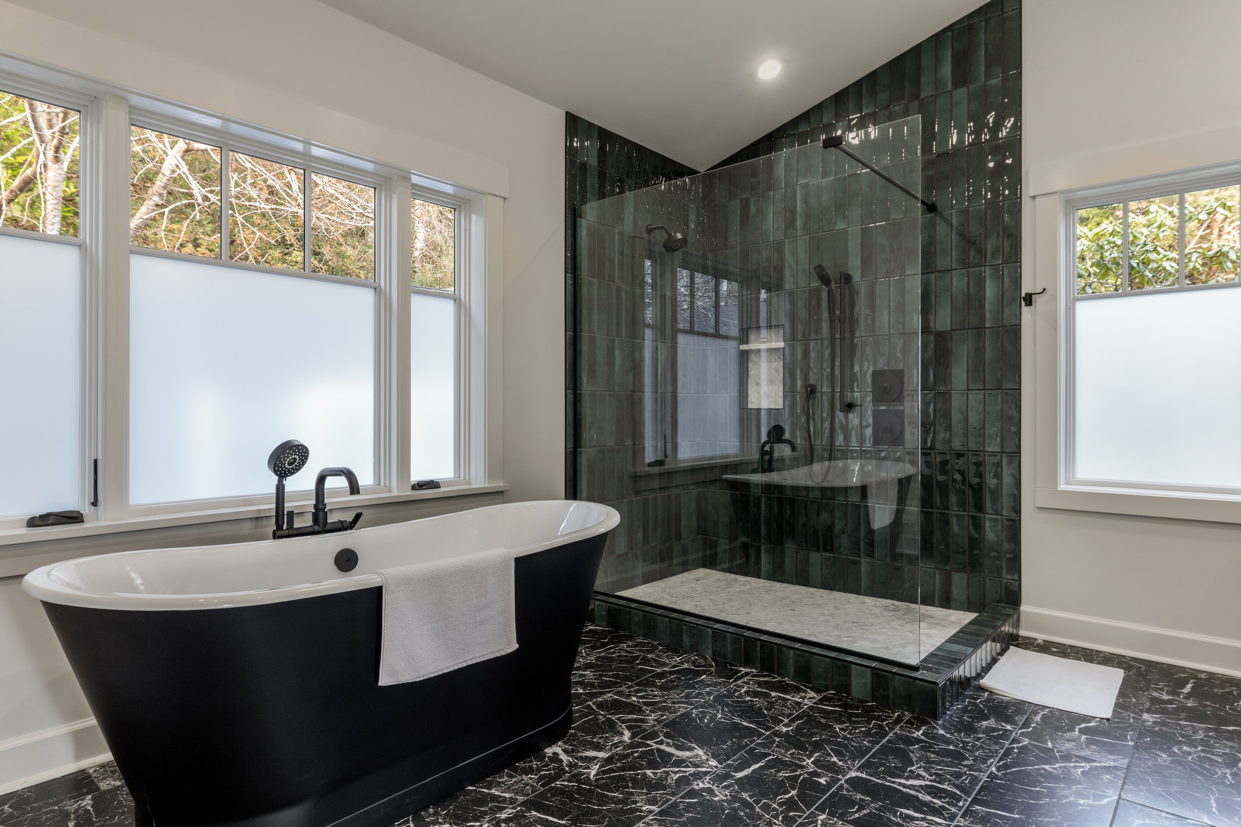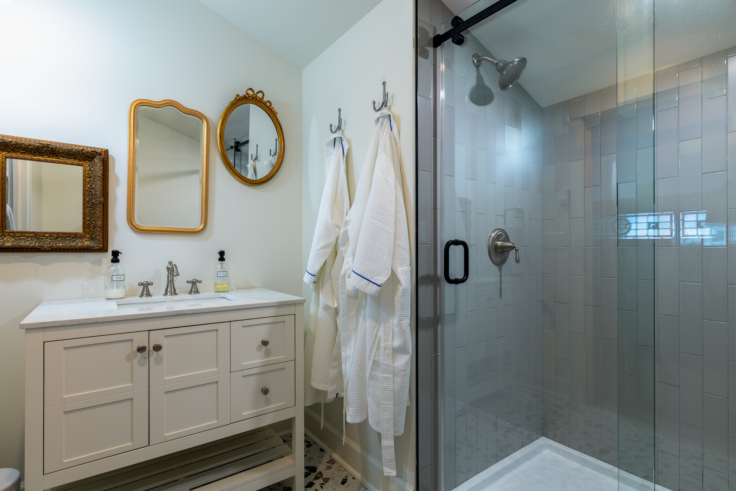 Down the hall, you’ll find a room with two twin beds and a conveniently located bathroom with a shower across the hall, plus a washer and dryer.