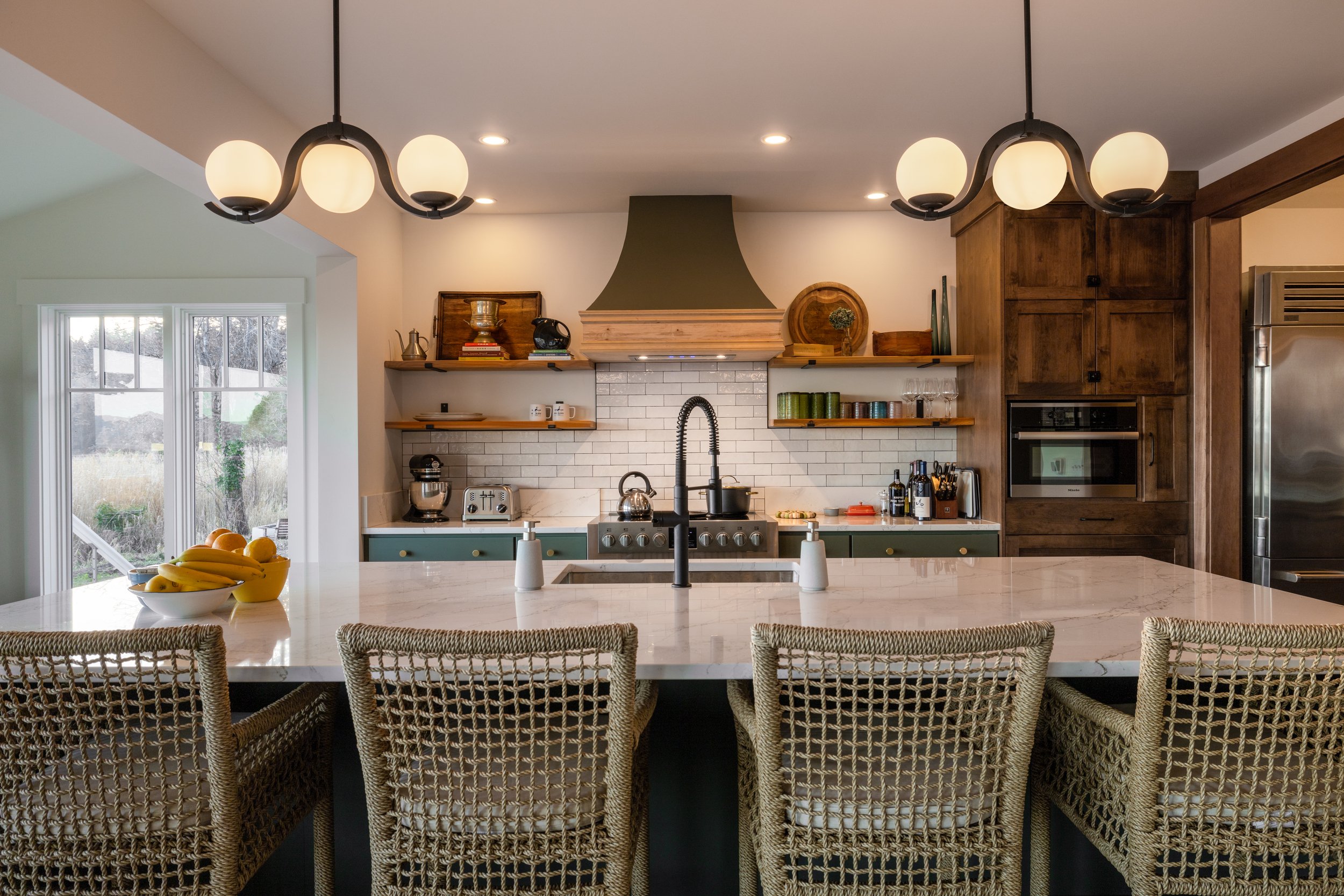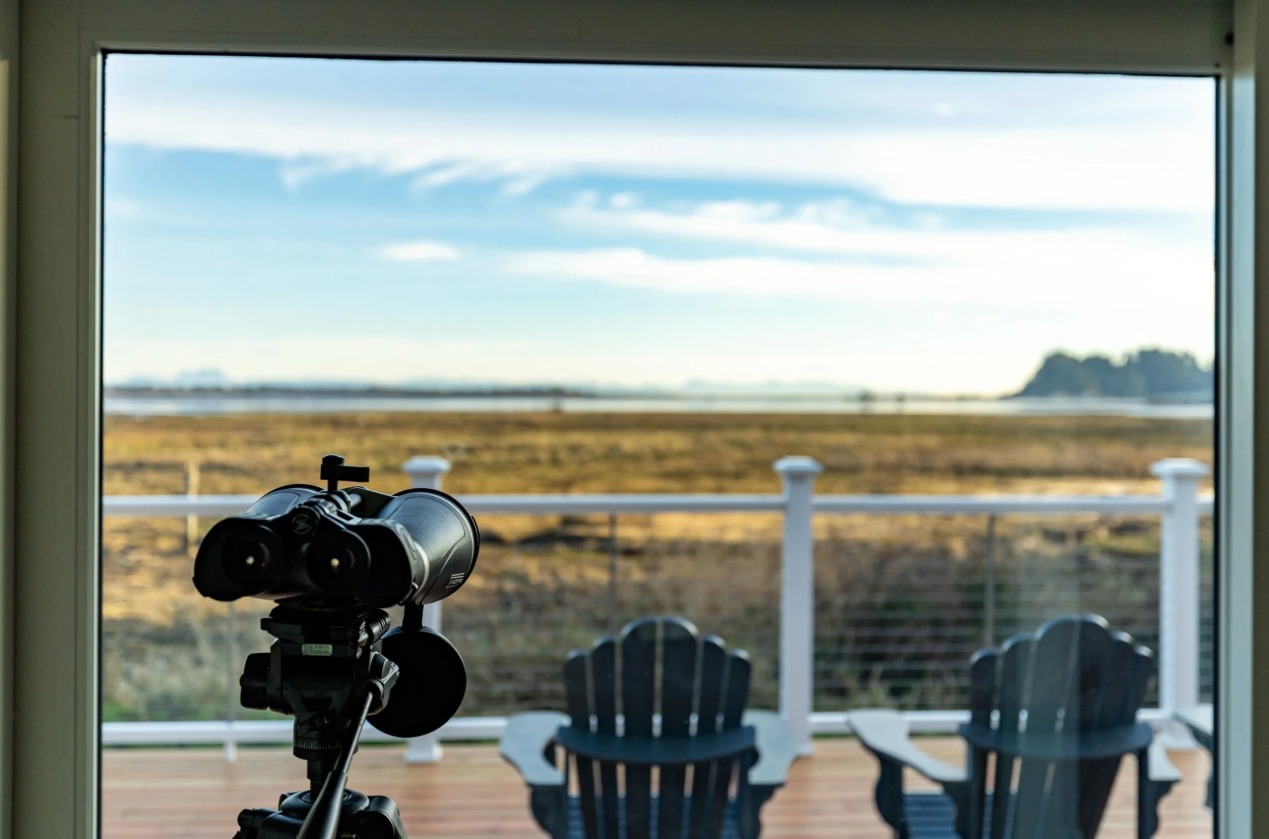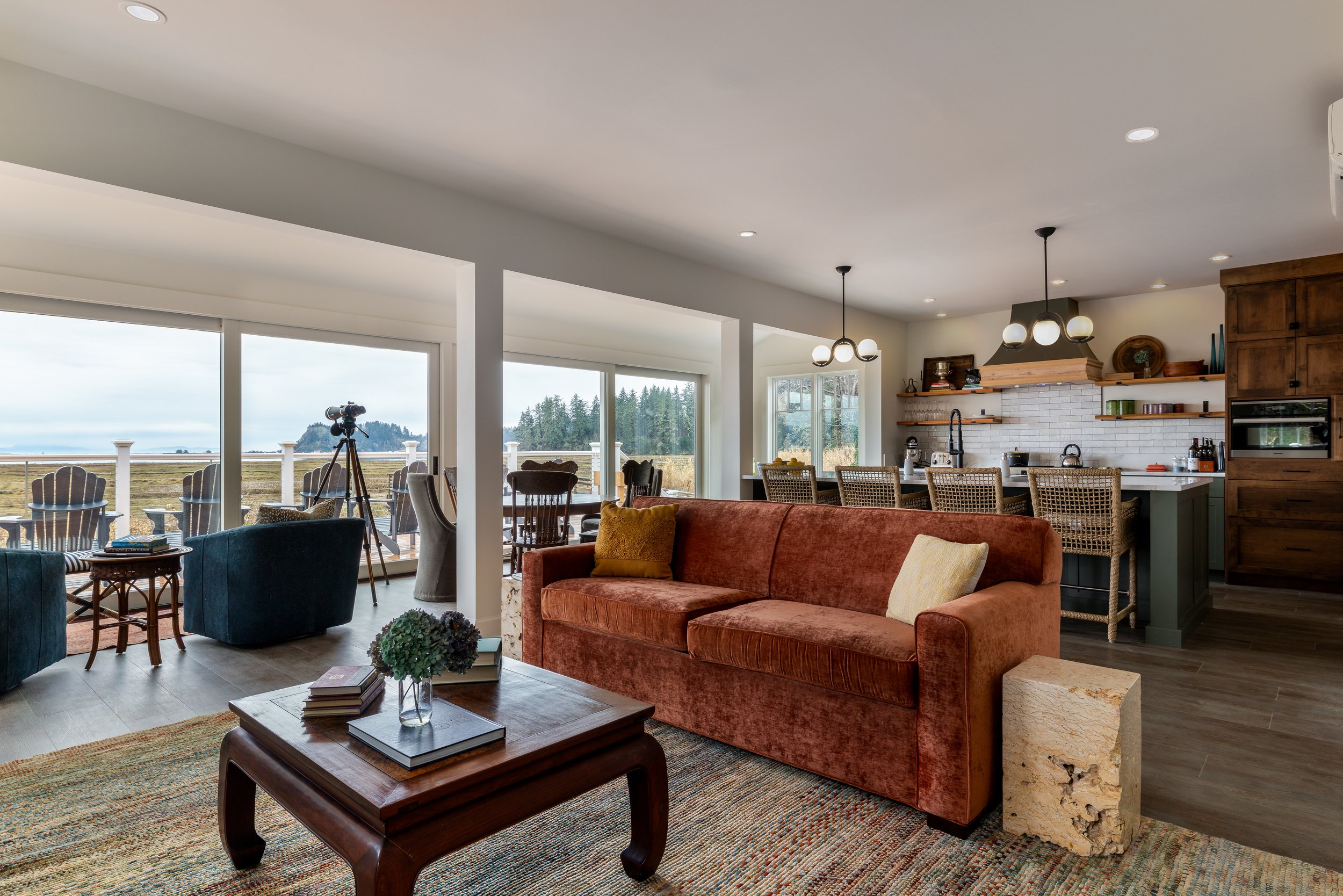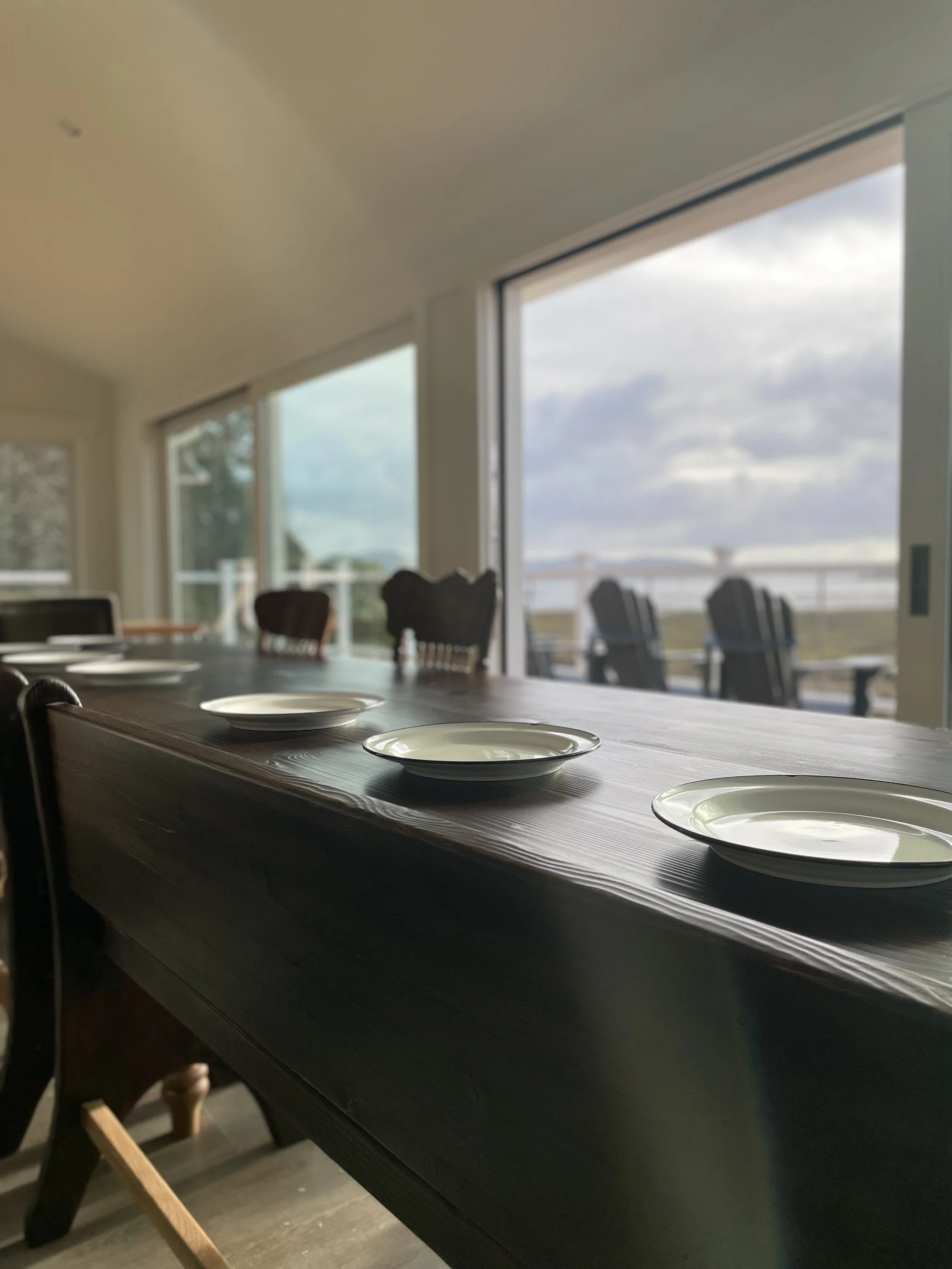 A chef’s kitchen: appointed for both casual family breakfasts and elegant dinner parties, complete with appliances, serving and dining ware and an island with additional seating for effortless gatherings. A small coffee bar is located just across from the oversized refrigerator that is supplied with coffee and a variety of tea and sugars. Anchoring the dining area, which features two floor to ceiling luxury sliding doors—offering full views of Baker Bay, is a magnificent table crafted from the original late 1800’s beams of Heron House, seating up to twelve and lending warm, storied character—an ideal centerpiece for special events, multi-generational trips, or intimate celebrations.