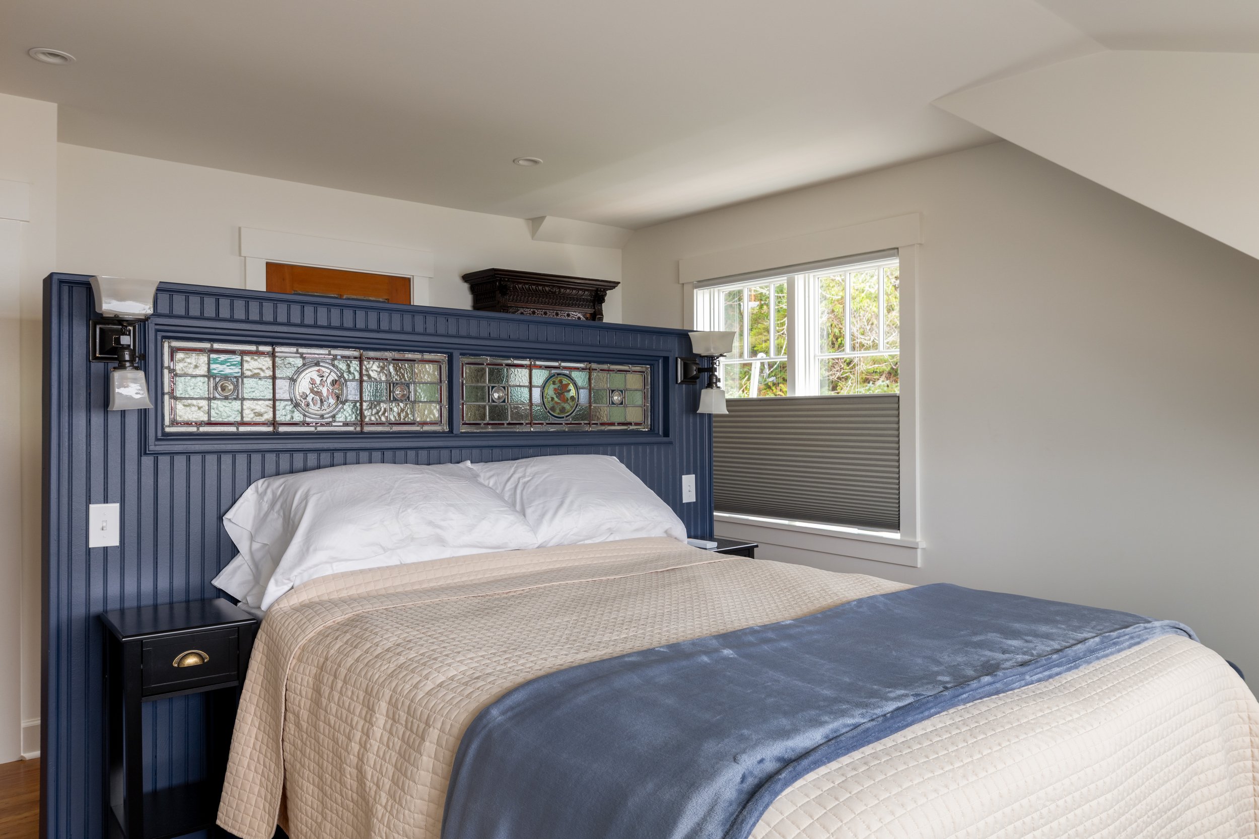 Upstairs feels like stepping back in time—original late-1800s wood floors and carefully restored stained glass doors lend authentic character to two queen bedrooms, each thoughtfully appointed with a private en suite bathroom, complete with a modern shower for comfort. Full waterfront views can be enjoyed from your bed with your morning coffee.